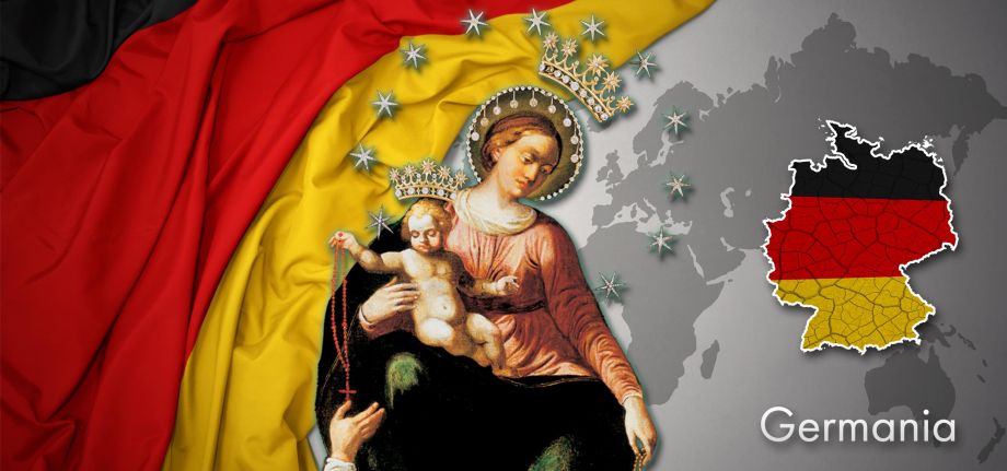 Im Namen des Vaters und des Sohnes und des Heiligen Geistes. Amen.O here Königin der Siege, o Herrin des Himmels und der Erde, an deren Namen sich die Himmel erfreuen und vor dem die Bösen erzittern, o glorreiche Königin des Rosenkranzes, wir Deine gläubigen Kinder vereinen uns (hier in Deinem Tempel in